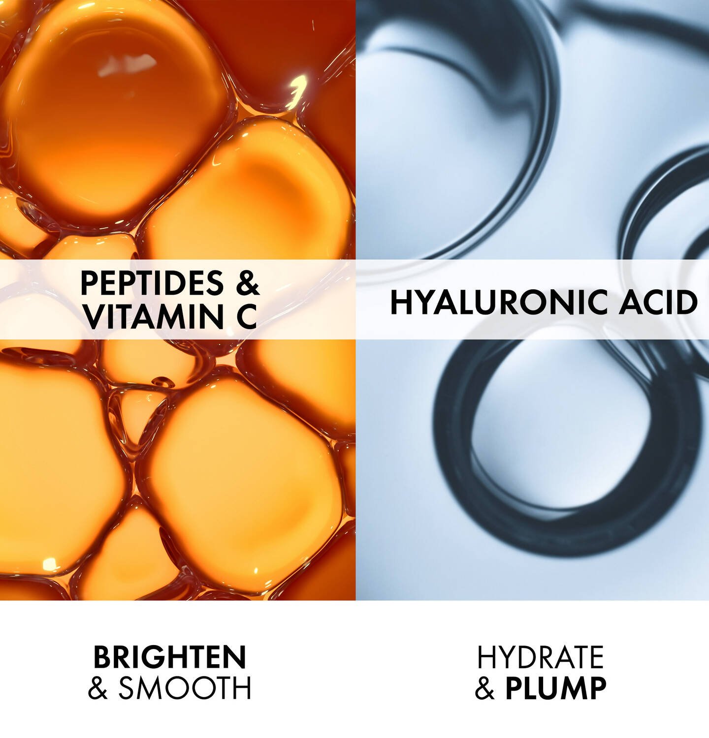 This formula is enriched with Hyaluronic acid, Peptides, and Vitamin C to help fight the early signs of skin aging by boosting radiance, plumping, and hydrating the skin.