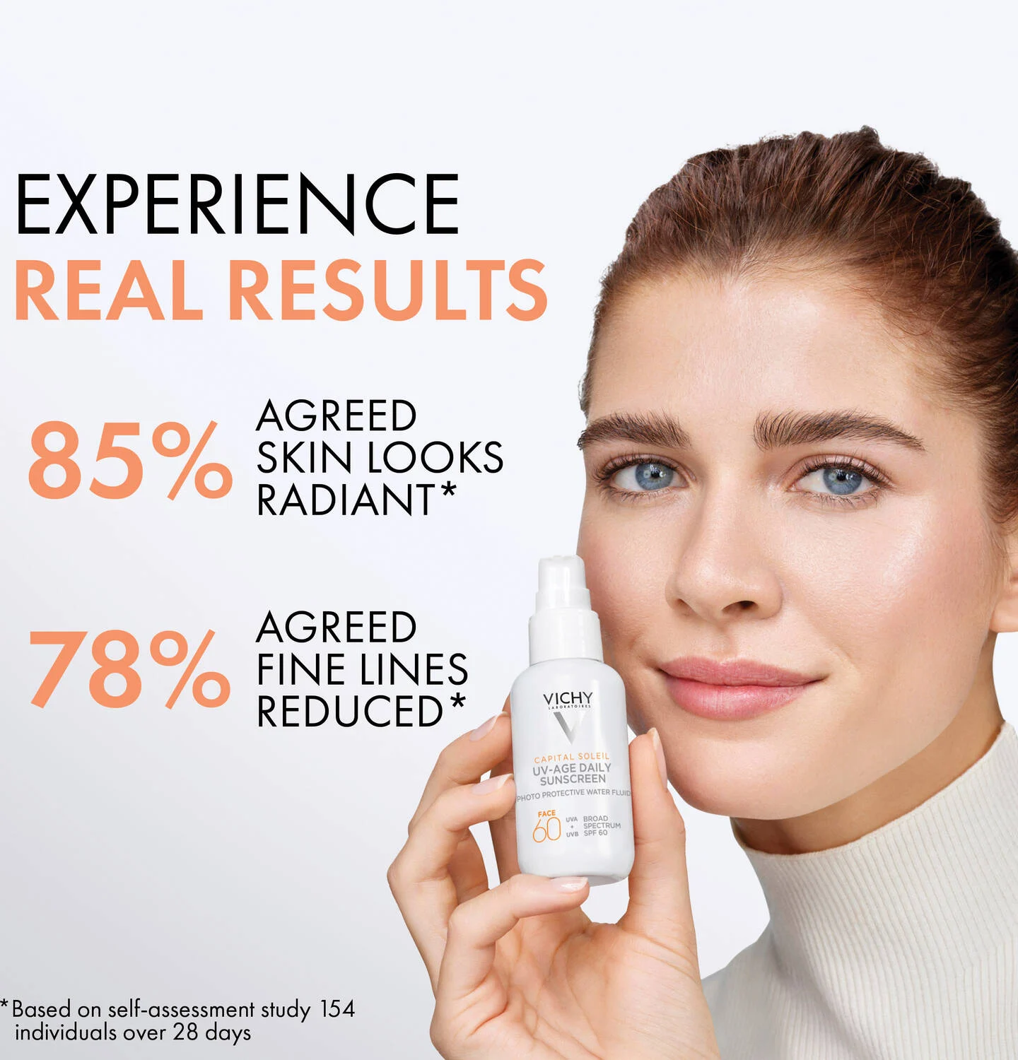 Capital Soleil UV-Age Daily SPF 60 with UVA + UVB protection is your daily defense against visible signs of aging. Our ultra-lightweight, photoprotective water fluid glides seamlessly and is invisible on all skin tones.